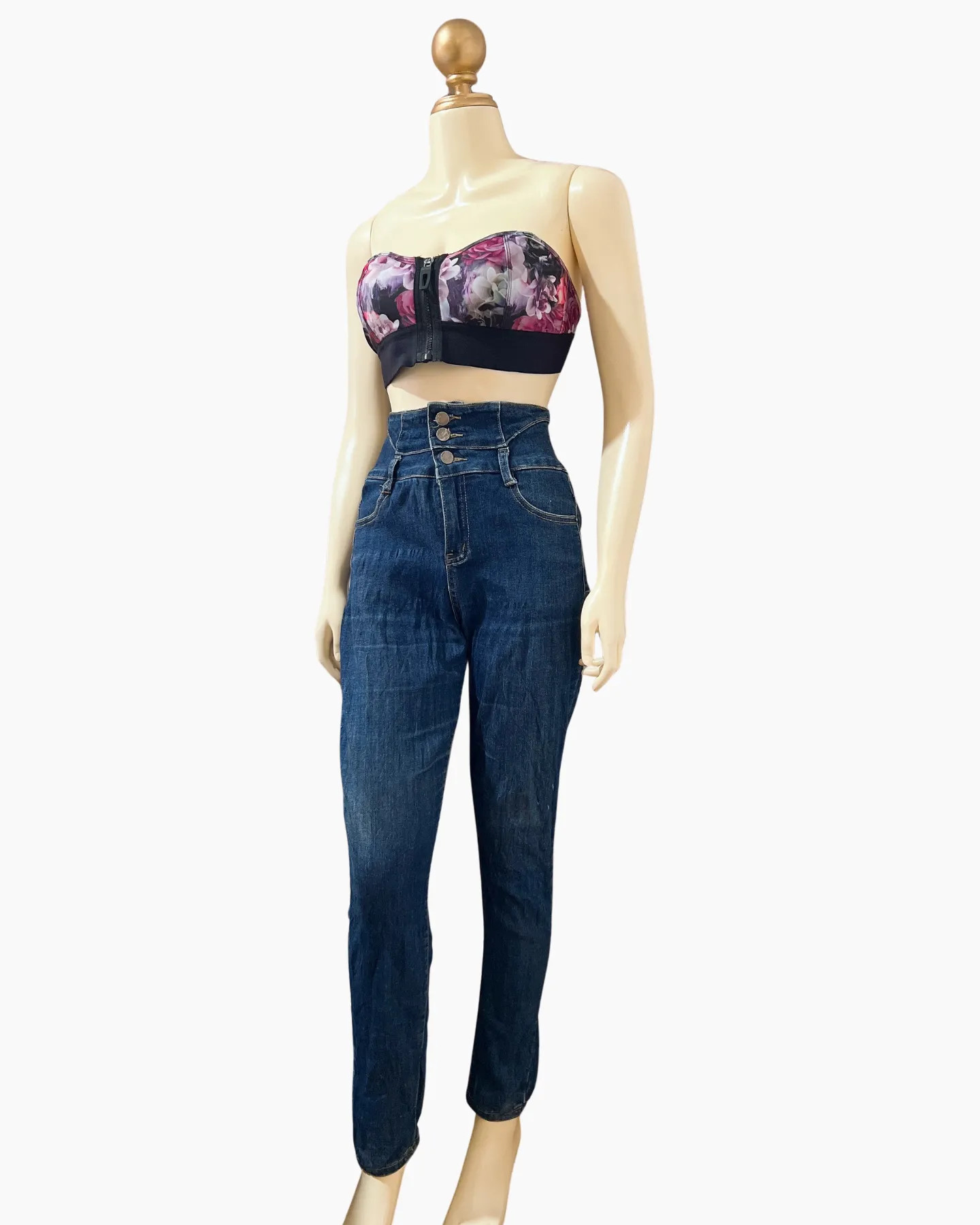 These high-rise dark-wash jeans offer a sleek, sculpted silhouette with their fitted, tapered leg design. The standout feature is the triple-button waistband, adding both style and extra support at the waistline. Crafted with durable denim and classic five-pocket construction, they provide everyday comfort with a polished look. Perfect for pairing with crop tops, bodysuits, or tucked-in blouses, these jeans effortlessly blend casual wearability with modern fashion flair.
