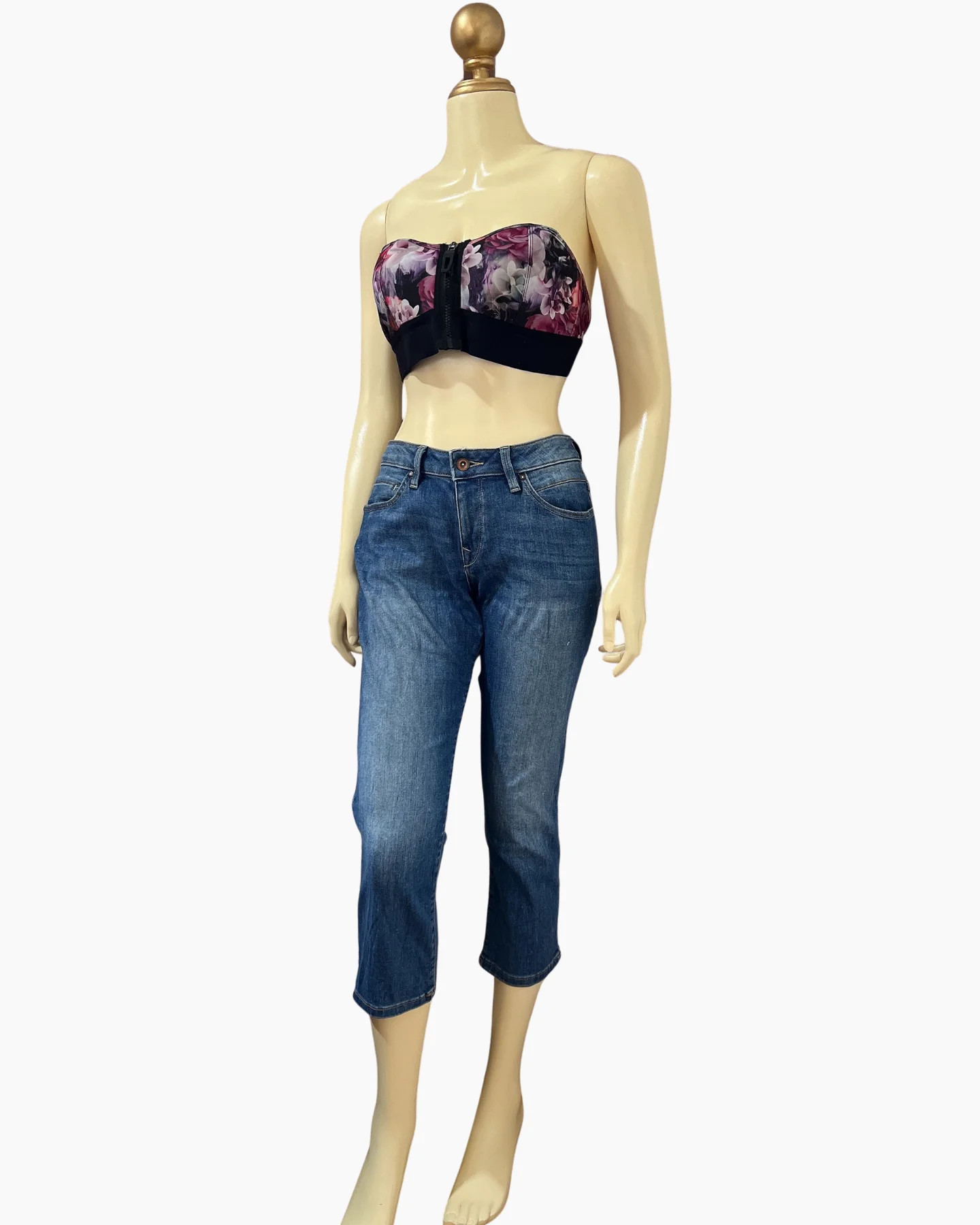These dark-wash denim jeans feature a flattering mid-rise waist and a slim, straight-leg silhouette that ends at a cropped length, hitting just above the ankles. Designed with traditional five-pocket construction and a button-zip closure, they offer a timeless, versatile look. The subtle whiskering and gentle fading add a naturally worn-in feel without overpowering the clean design. Comfortable and easy to style, these jeans pair well with casual tops, tanks, or layered outfits for everyday wear.