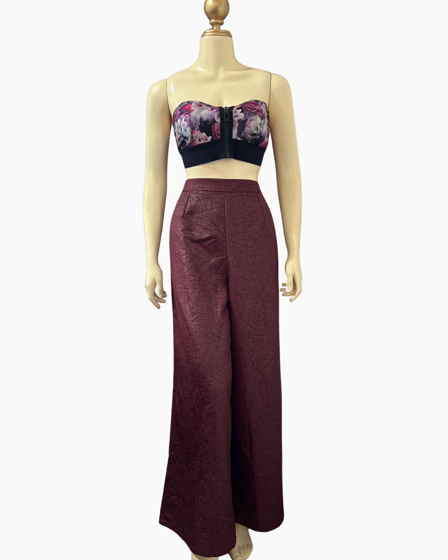 These pants are high-waisted, full-length wide-leg trousers in a rich burgundy color. They feature an all-over crinkled or textured fabric that adds depth and a subtle sheen. The fit is long and flowy, giving them an elegant, dressy look suitable for eveningwear or polished daytime outfits. The clean front and minimal detailing keep the silhouette sleek and sophisticated.